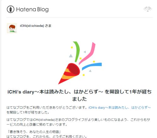 ブログを開設して一年が経った。(ことに4日後に気づく・・・) 一年続けることができてうれしい。 いろんなブログを見ていると、何年も続いているか数カ月で消えてゆくかの2パターンの気がする。(私調べ) ということは、私のブログもこれから10年は続…