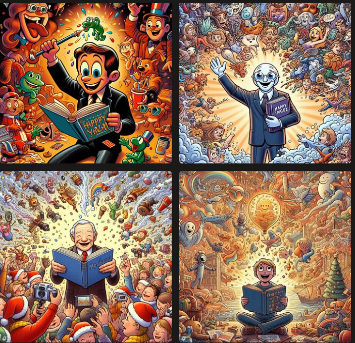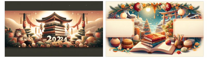 2024年のお正月らしいイラストを書かせたい。本をモチーフに入れて、めでたいイメージを生成してください。ブログのアイキャッチにします。で書き出したものが随分私が日本在住であることを全面に打ち出しすぎてたので、